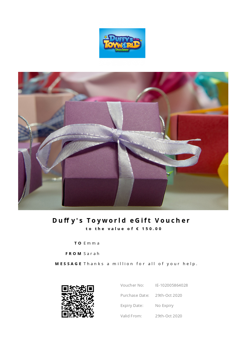 Duffy's Toyworld Dunleer allows you to purchase instantly printable gift vouchers, special offers and tickets using the Voucher Connect platform.